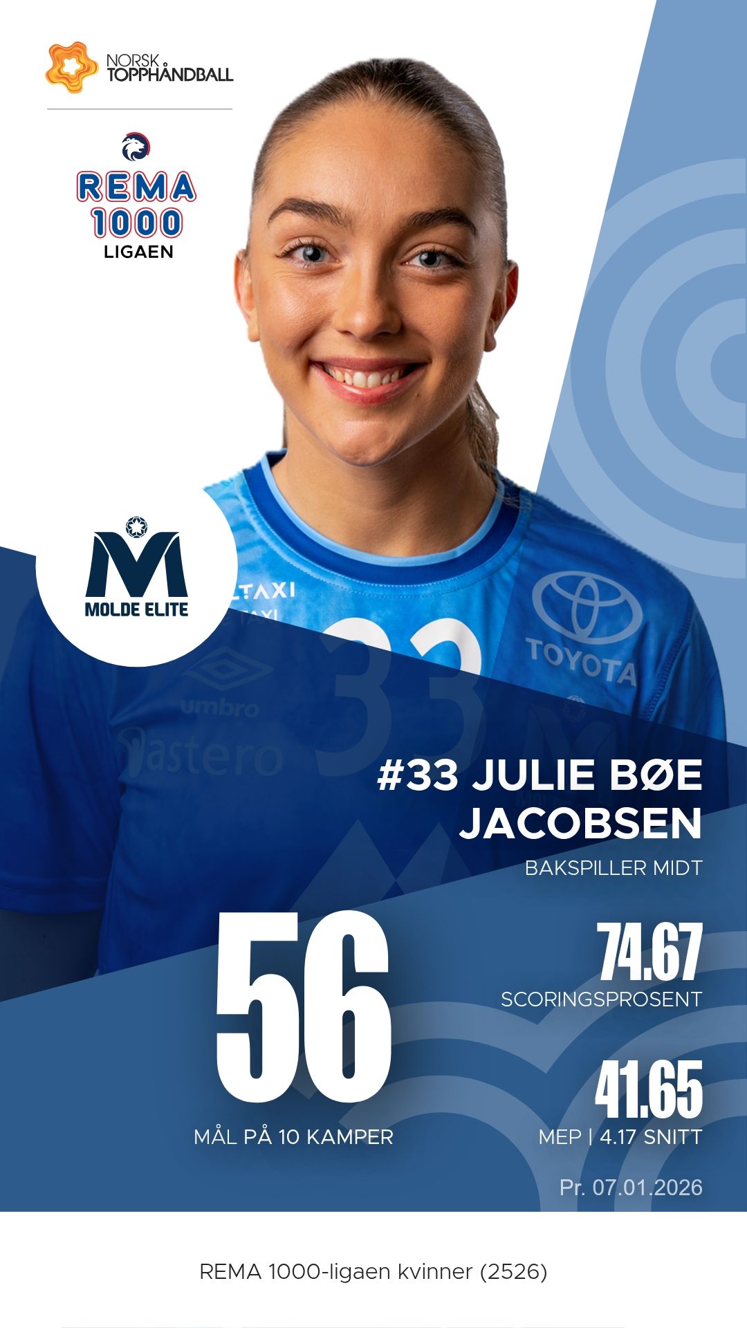 Molde HK Elite stiller med flere sterke kort i angrep. Julie Bøe Jacobsen er lagets ubestridte motor og playmaker, med imponerende 56 mål og 47 målgivende pasninger så langt. Hun styrer angrepsspillet med presise pasninger og skarpe krysninger som åpner rom for både bakspillere og kantene. På venstresiden har Jenny Carlsson vært en jevn måltrussel, mens Johanne Halseth Nypan har bidratt med både fart og kreativitet fra høyre bakspillerposisjon. I mål står Eli Smørgrav Skogstrand, som har levert flere viktige redninger og ofte setter i gang raske kontringer med presise utkast.